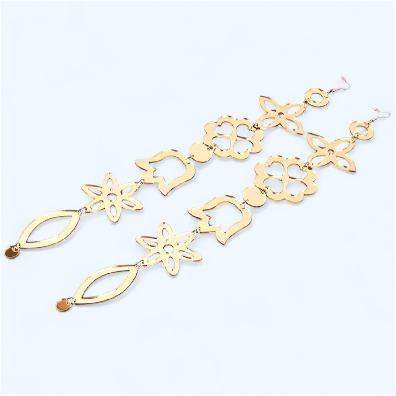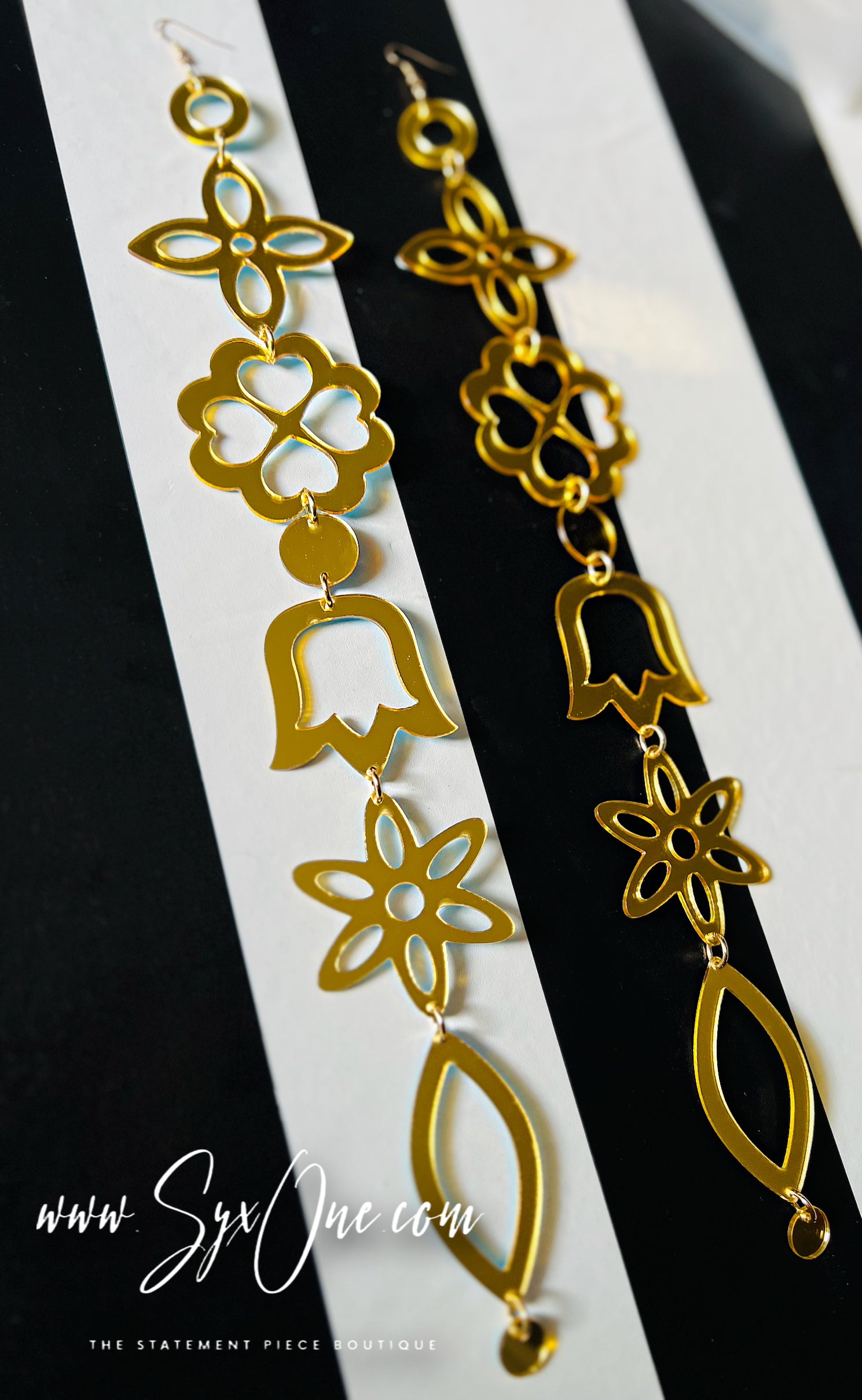 Crafted from lightweight acrylic material, these beautiful flower earrings boast an elegant 14-inch length and a stunning mirrored amber tone.