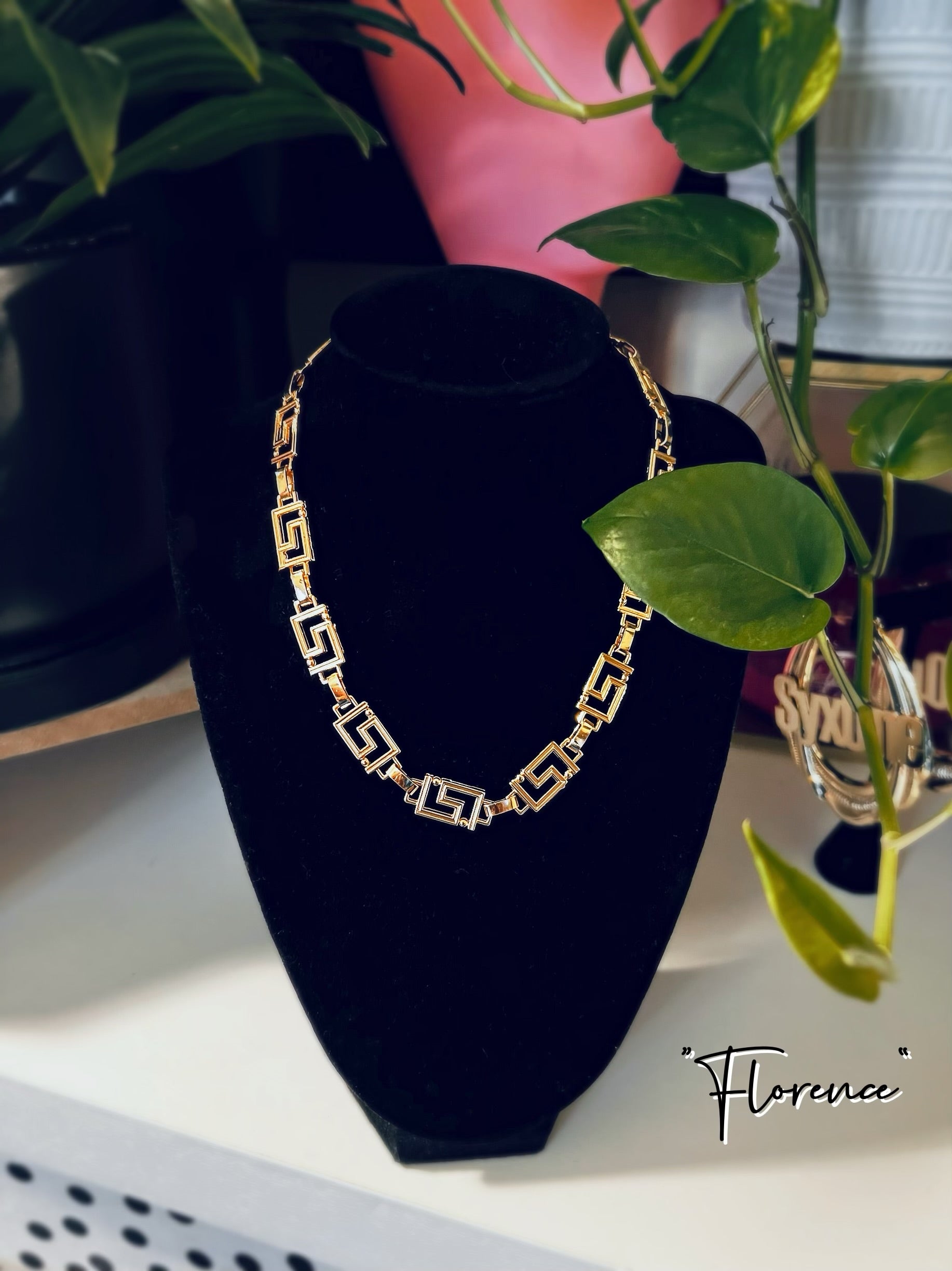 Our retro Florence clavicle necklace sports the luxuriously chic Greca pattern, a beautiful beast to add to your Statement Piece collection! 😉