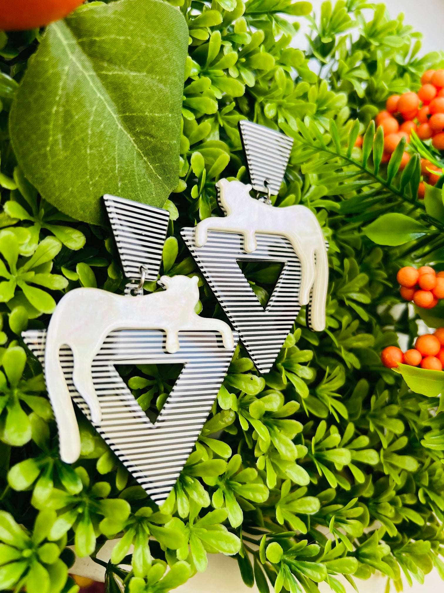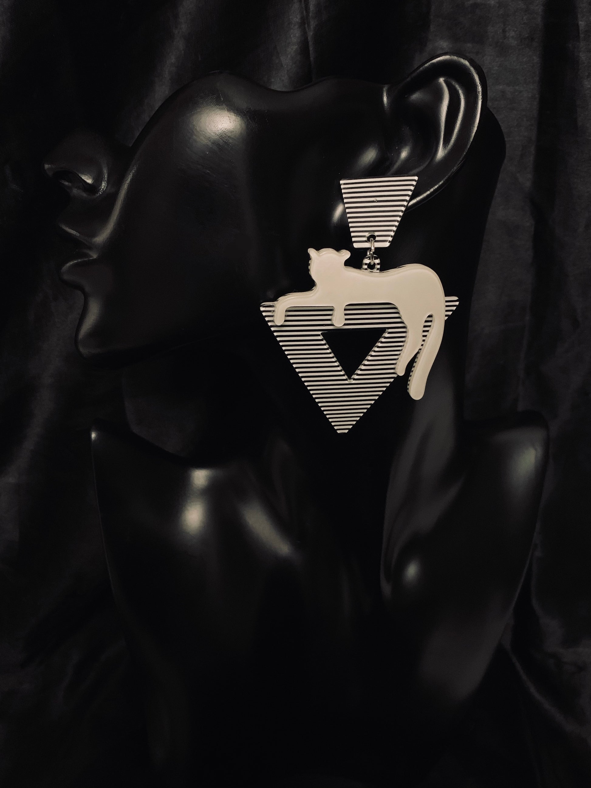 Discover the bold elegance of our "Kenya" inspired earrings. These glossy ivory earrings showcase a sleek black panther sitting atop a striking pinstripe pyramid design. Made from high-quality resin, these earrings are sure to make a statement and elevate any outfit.