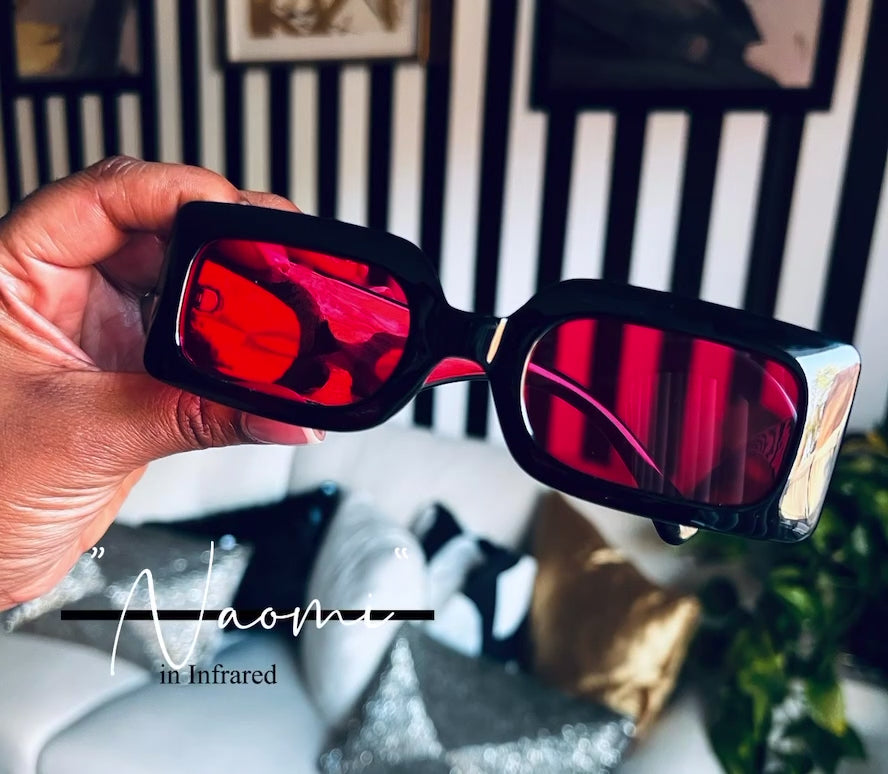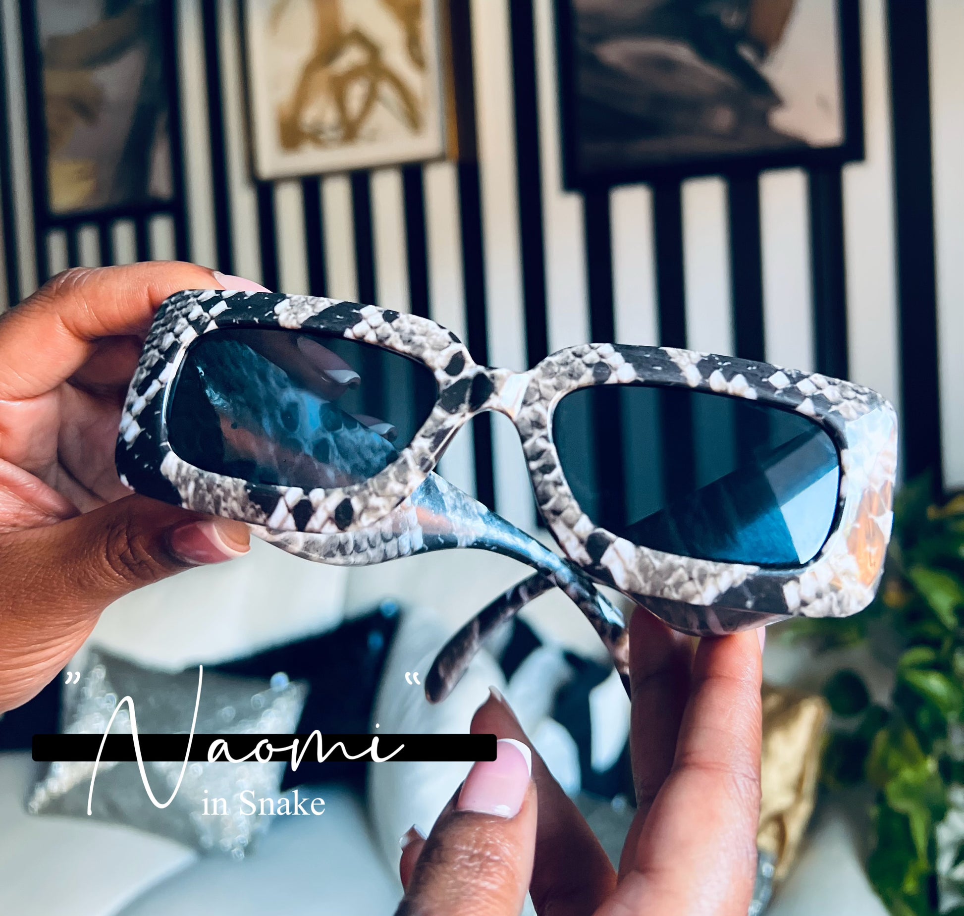 Introducing "Naomi", the perfect blend of retro and modern style. These square sunglasses feature an embedded chevron design, crafted with durable yet lightweight acrylic for all-day comfort. Available in both Snake and Black/Infrared lens options. Stand out in style with Naomi.