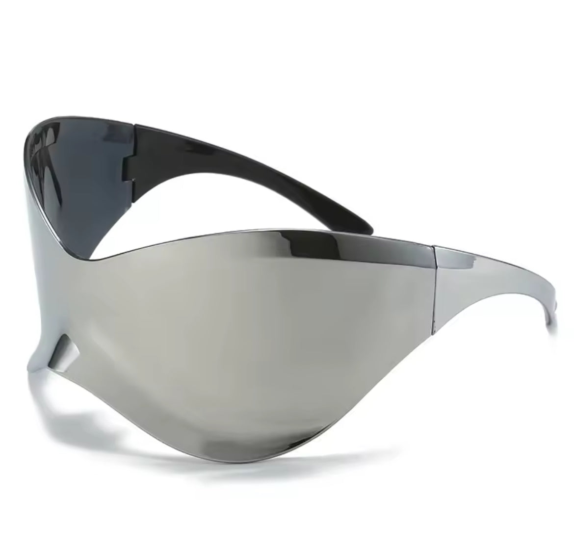 Explore a bold, futuristic look with these lightweight oversized sunglasses, offered in both silver and black options.