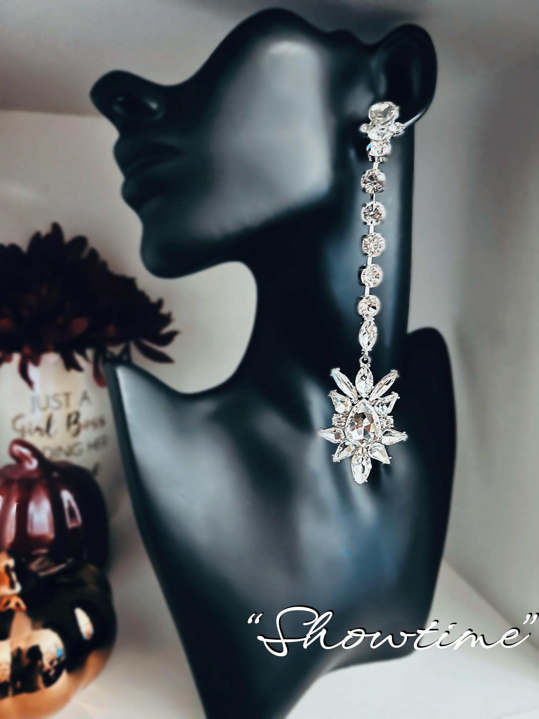 Experience the spotlight with our “Showtime” earrings! Featuring a long chain and large rhinestone water drop design, these earrings will elevate any outfit. Stand out with confidence and style.It’s show time!