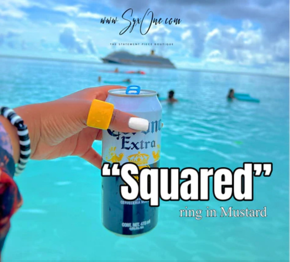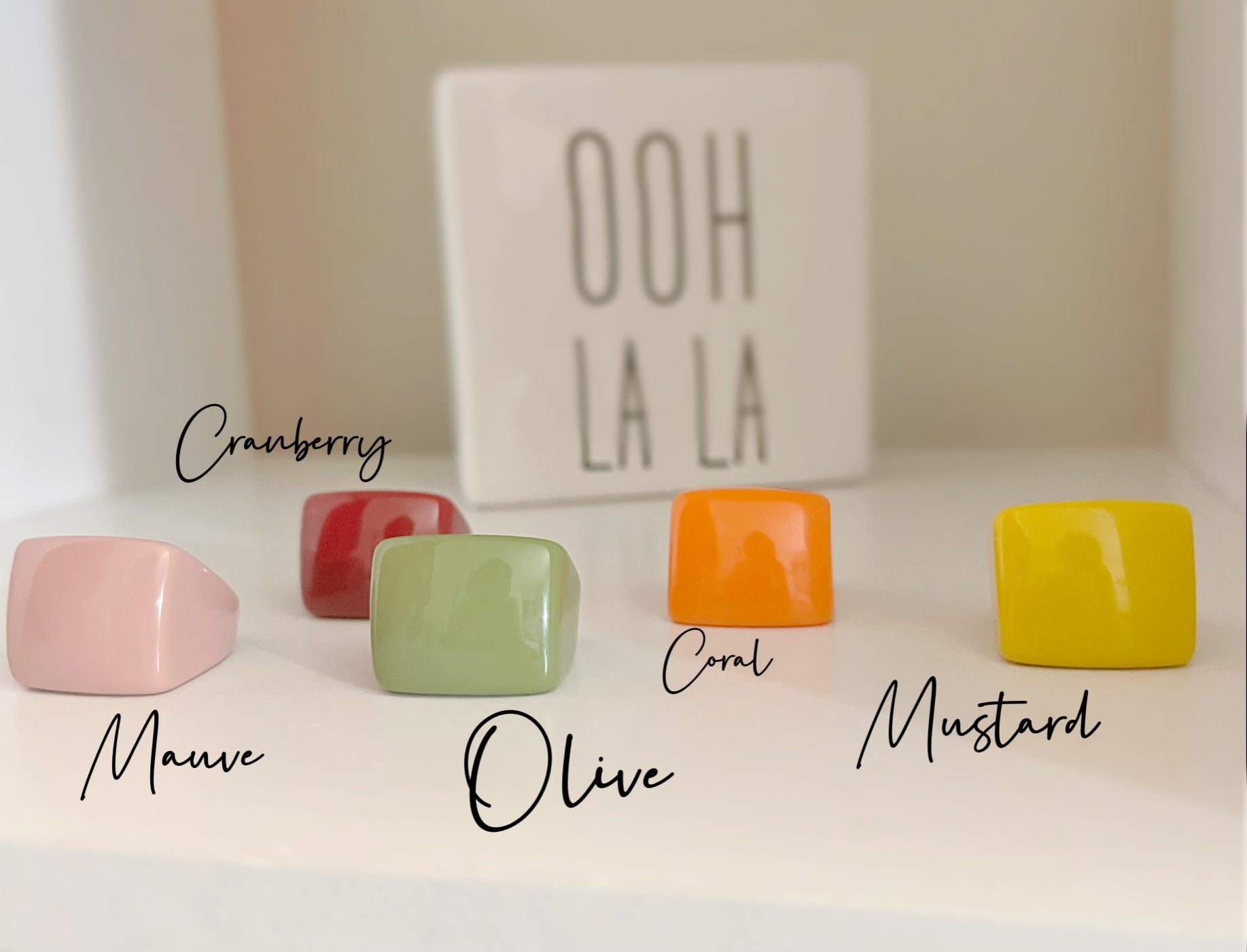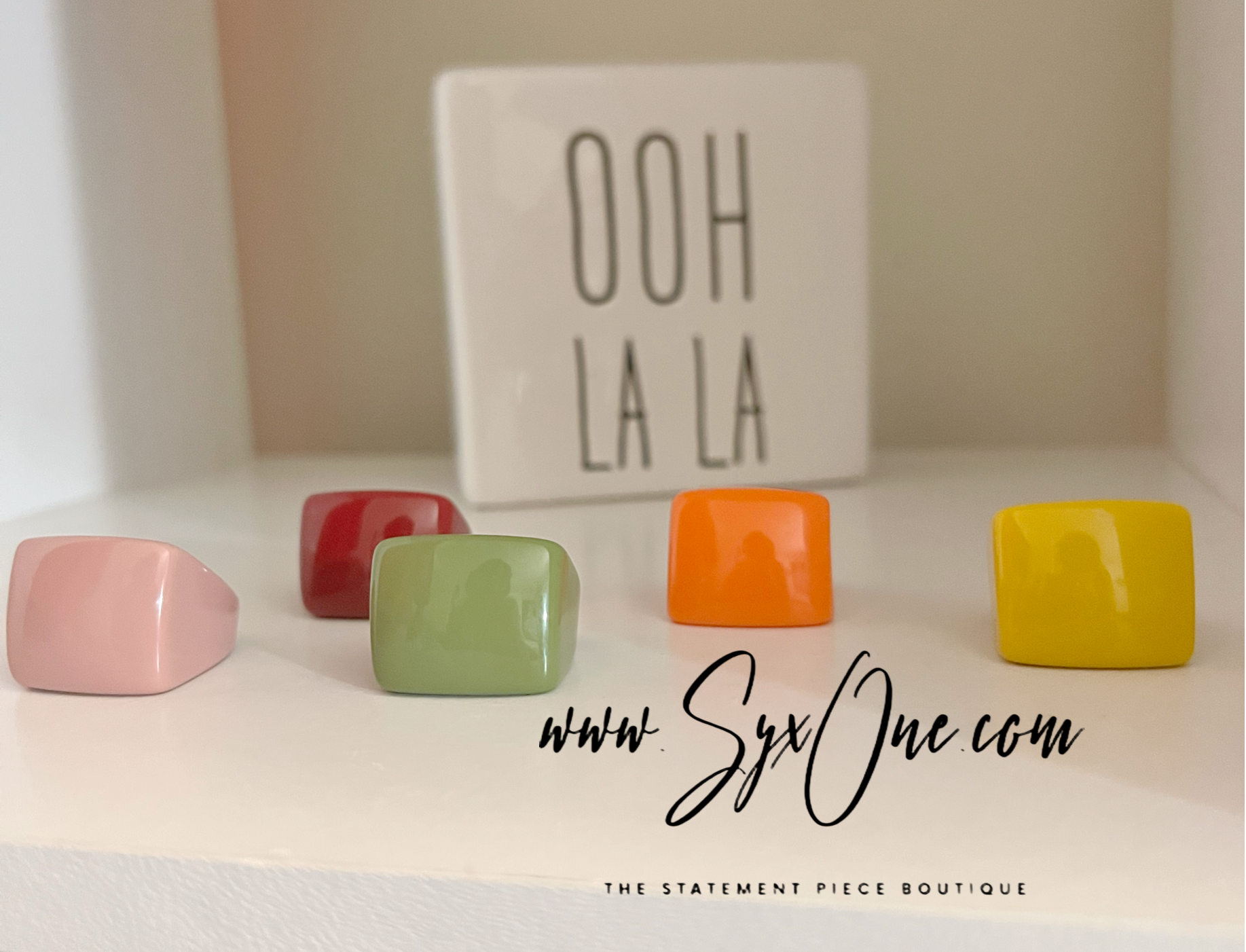 The "Squared" rings are the perfect addition to your stackable collection, bringing a modern and trendy touch to your style. Each resin made ring features a vibrant, glossy finish in shades such as mauve, coral, mustard, olive, and cranberry. These rings are expertly crafted from resin materials, making them safe to wear in water. With a ring size of approximately 7 inches, they can also be worn as a trendy midi ring.