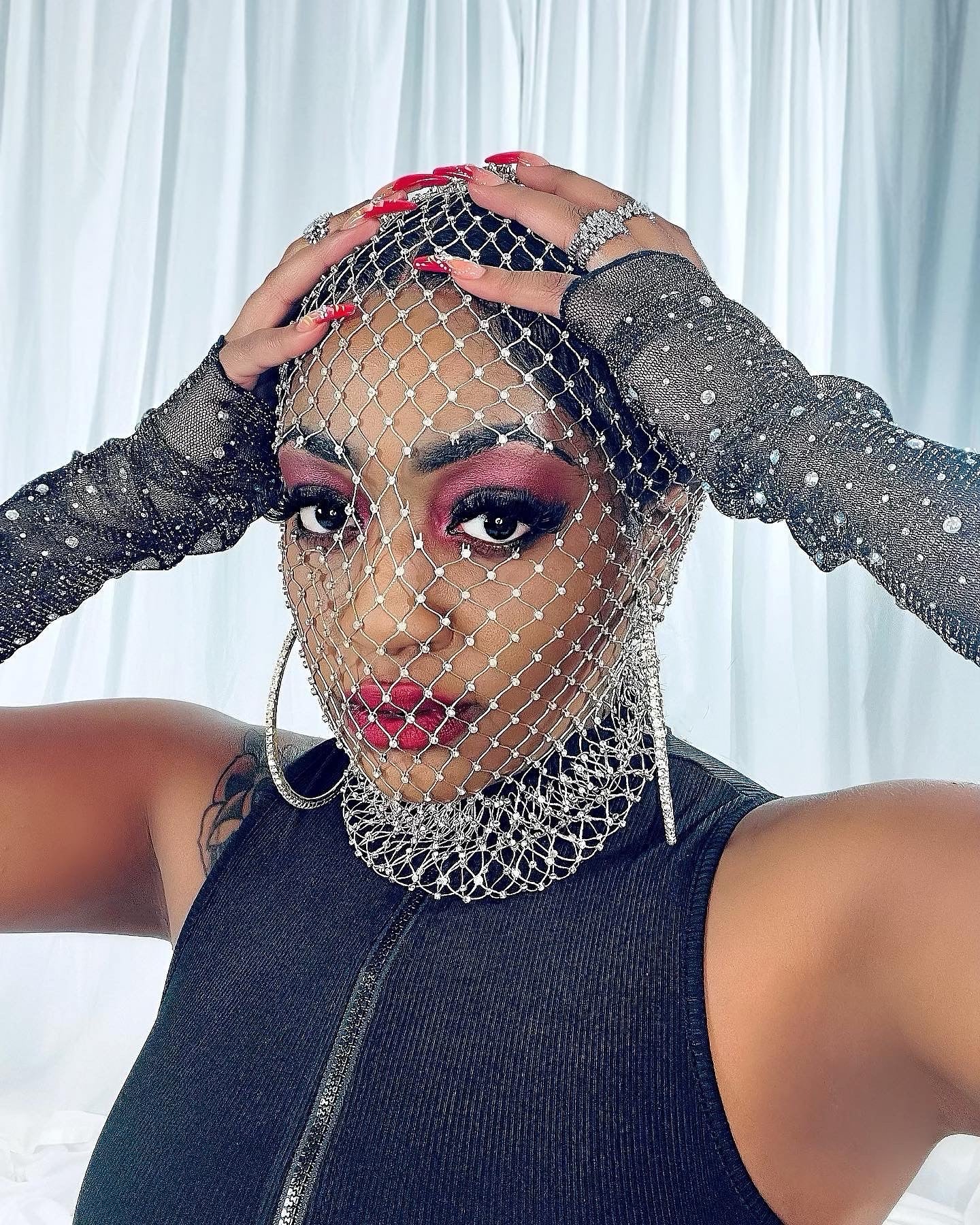 Make a bold statement with the STICKY face mask - one size fits most, and you can choose between gold or silver elastic and a diamond fishnet pattern.