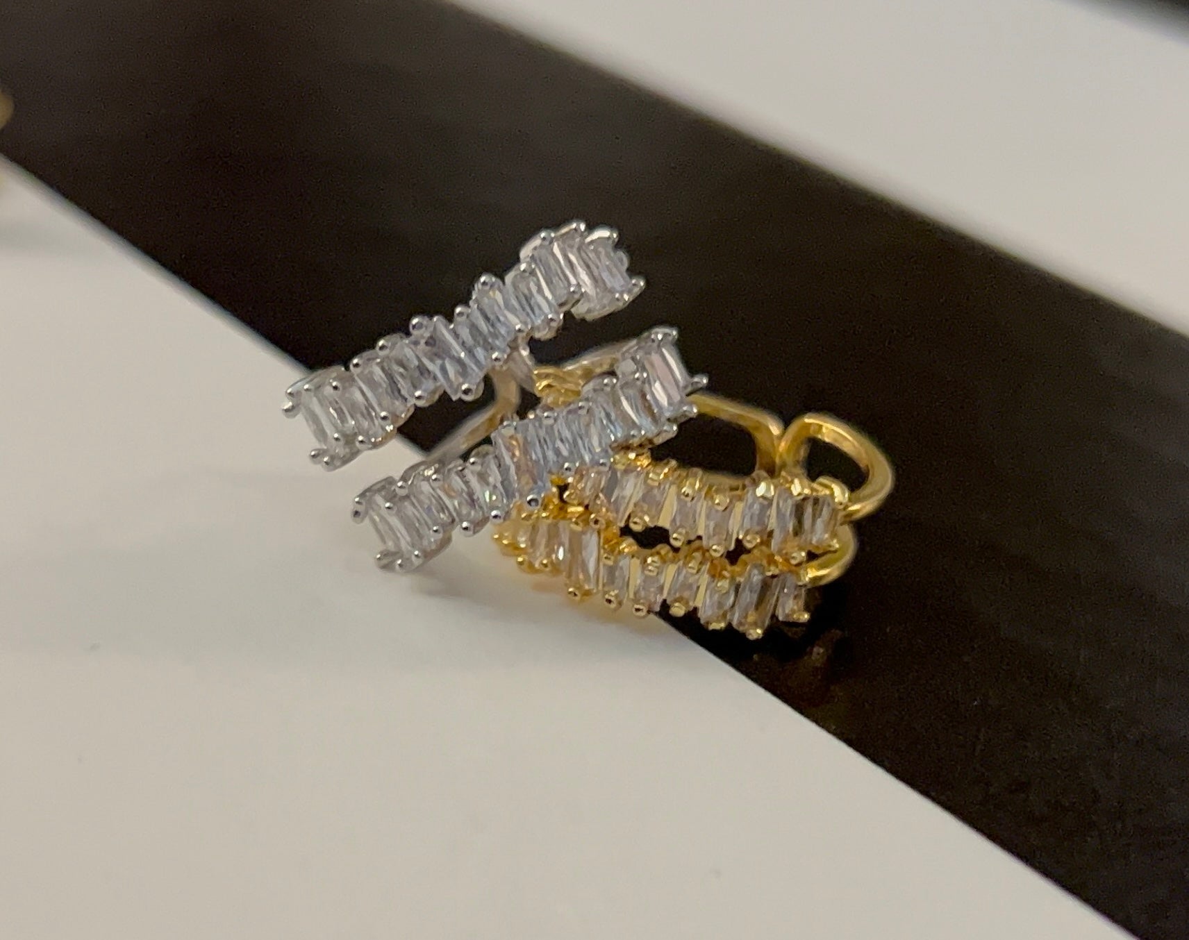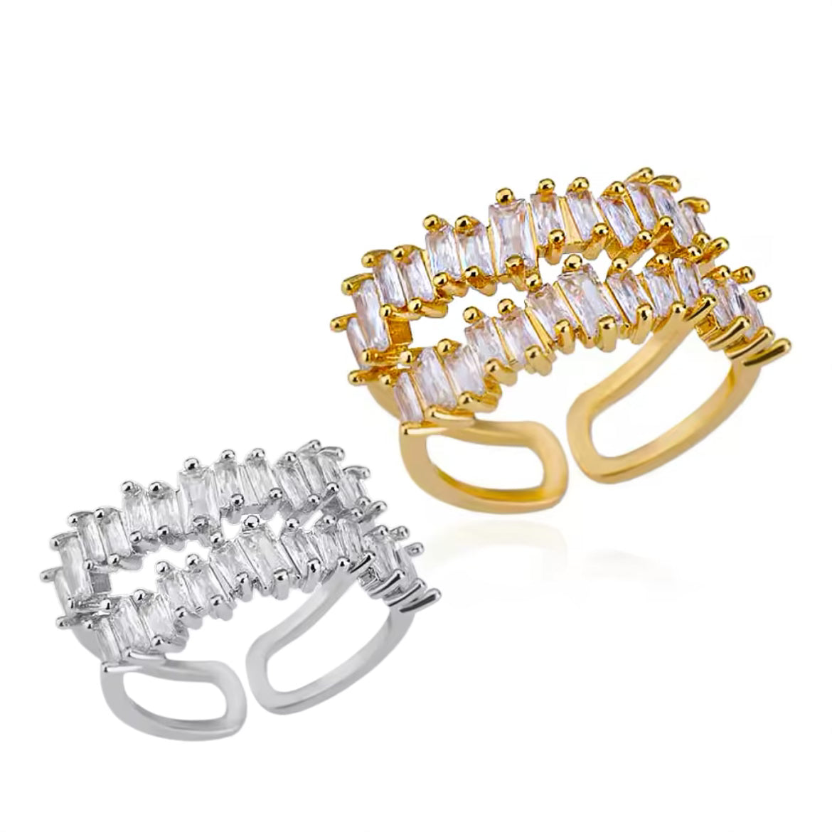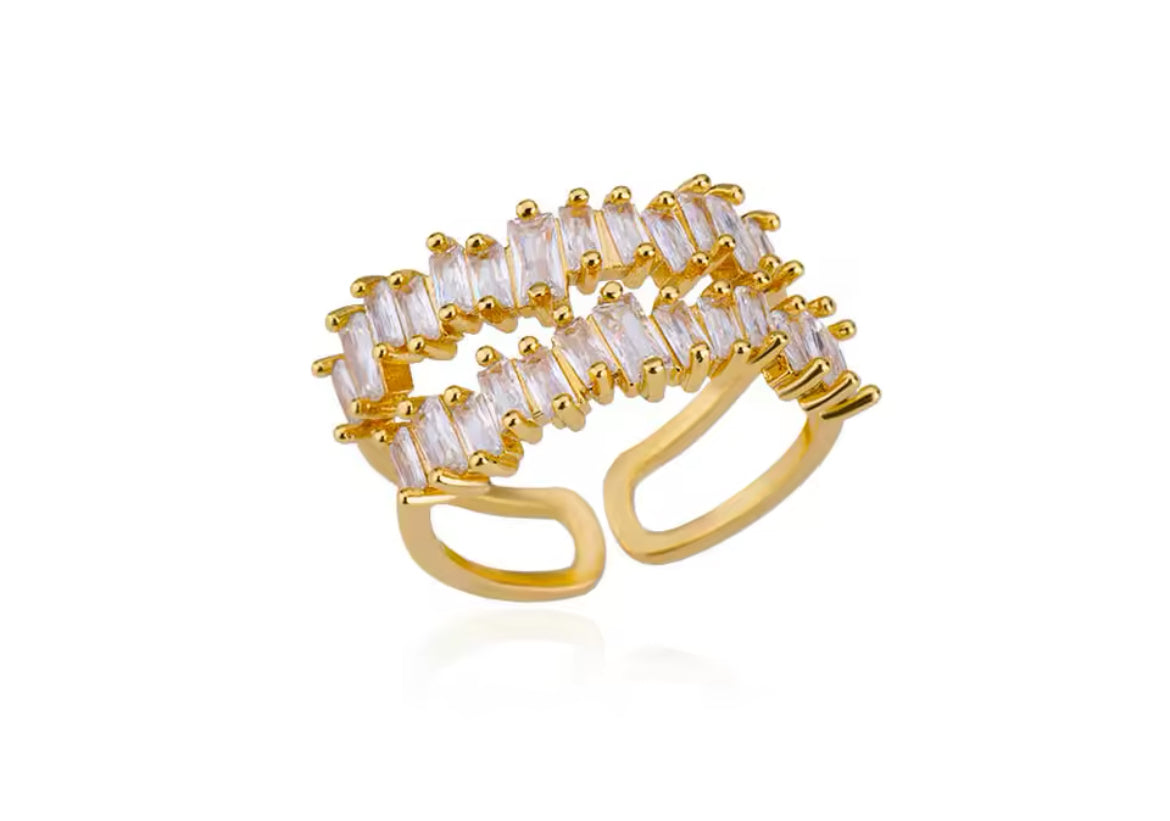 This adjustable ring features double stacked jagged rhinestones, offering a major shine and sparkle. With its adjustable design, it can easily fit all sizes.