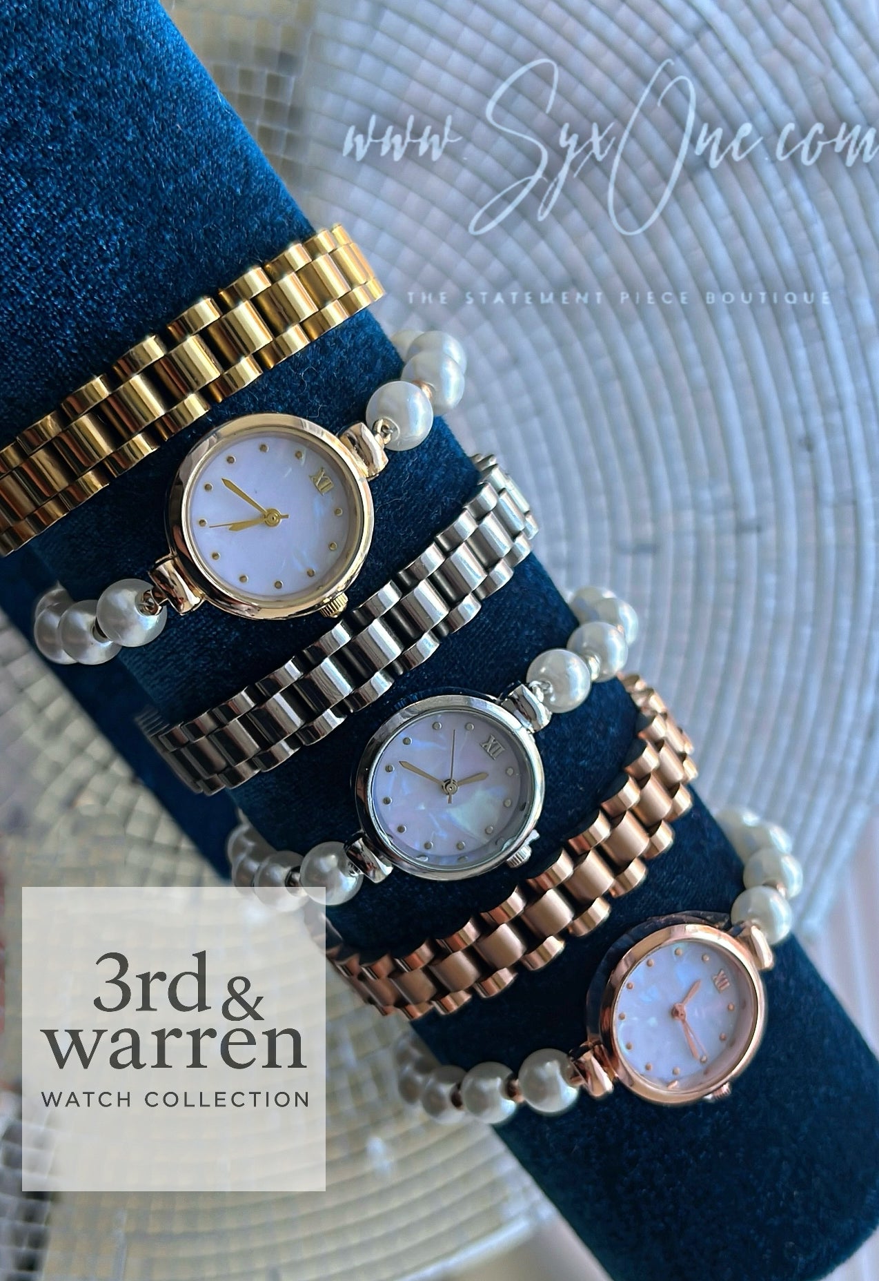 Introducing the debut watch of the 3rd & Warren Collection: PEARLIE! This elegant timepiece boasts a stainless steel adjustable toggle band, shiny pearl accents, and a sparkling iridescent face with a Roman numeral 12. Available in silver, gold, and rose gold options.