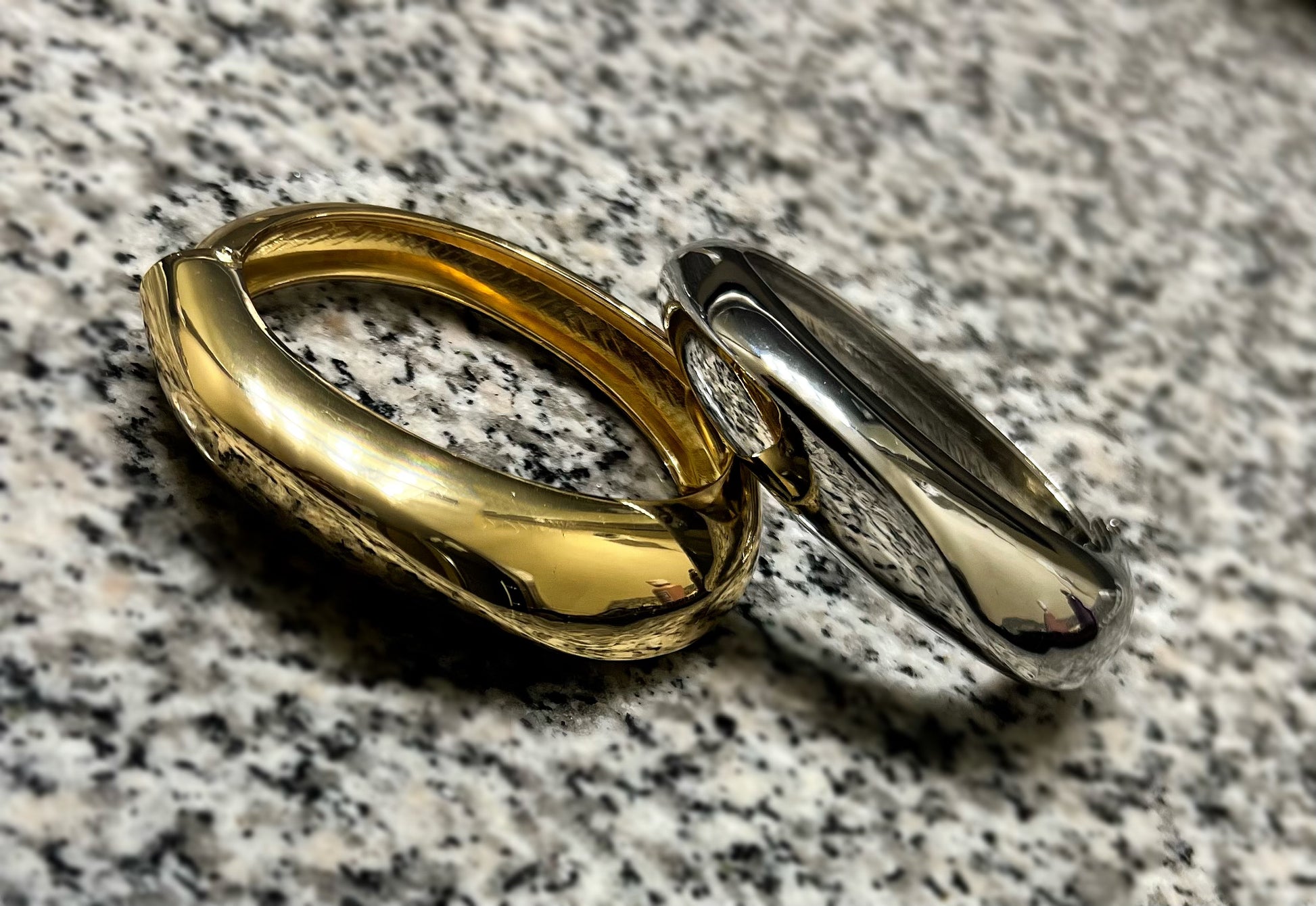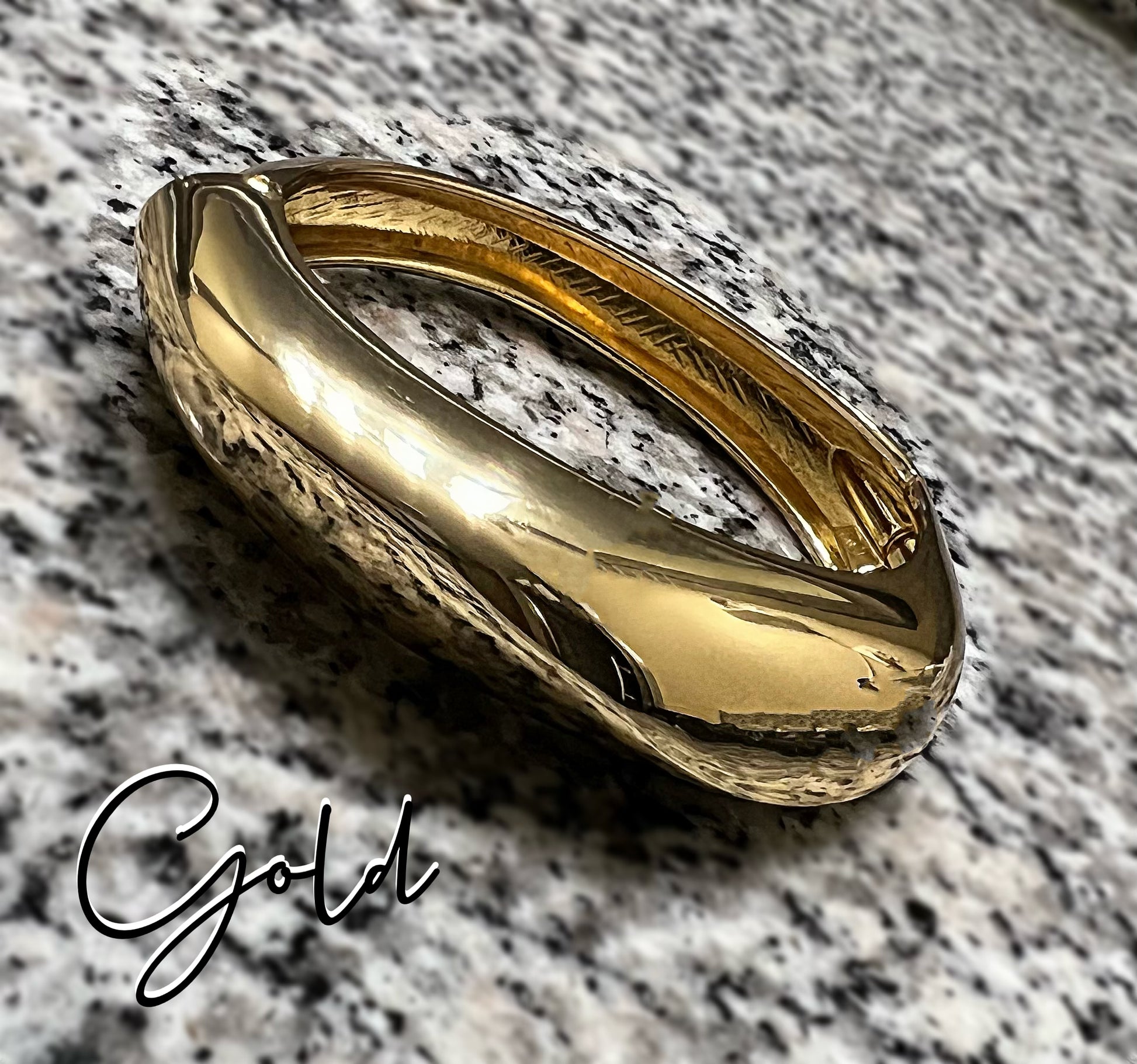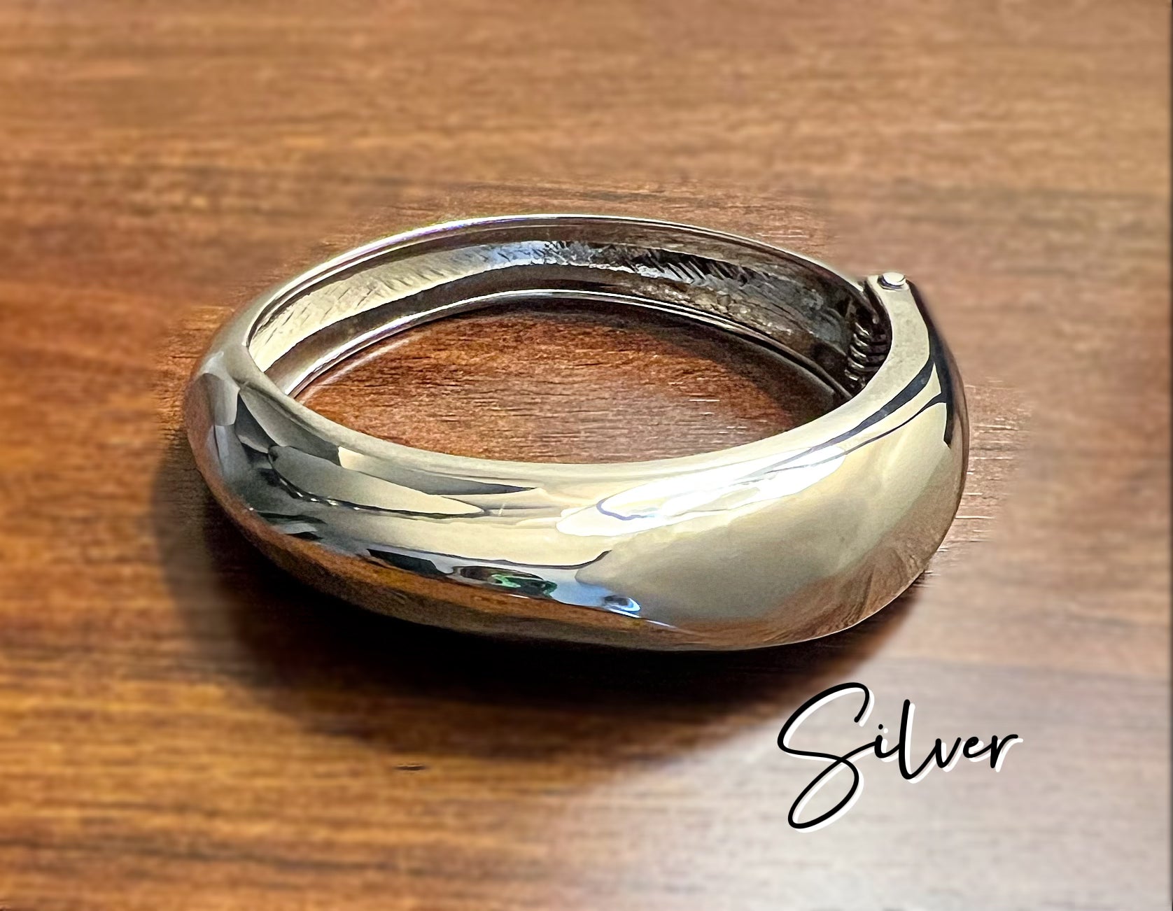 The perfect bangle is now available in both silver and gold options. Its chunky, curvy structure is designed to complement your favorite Syx One statement pieces. Featuring a snap cuff closure and weighing only 0.1 lbs, it is a chunky but lightweight accessory that fits most 6-7 inch wrists.