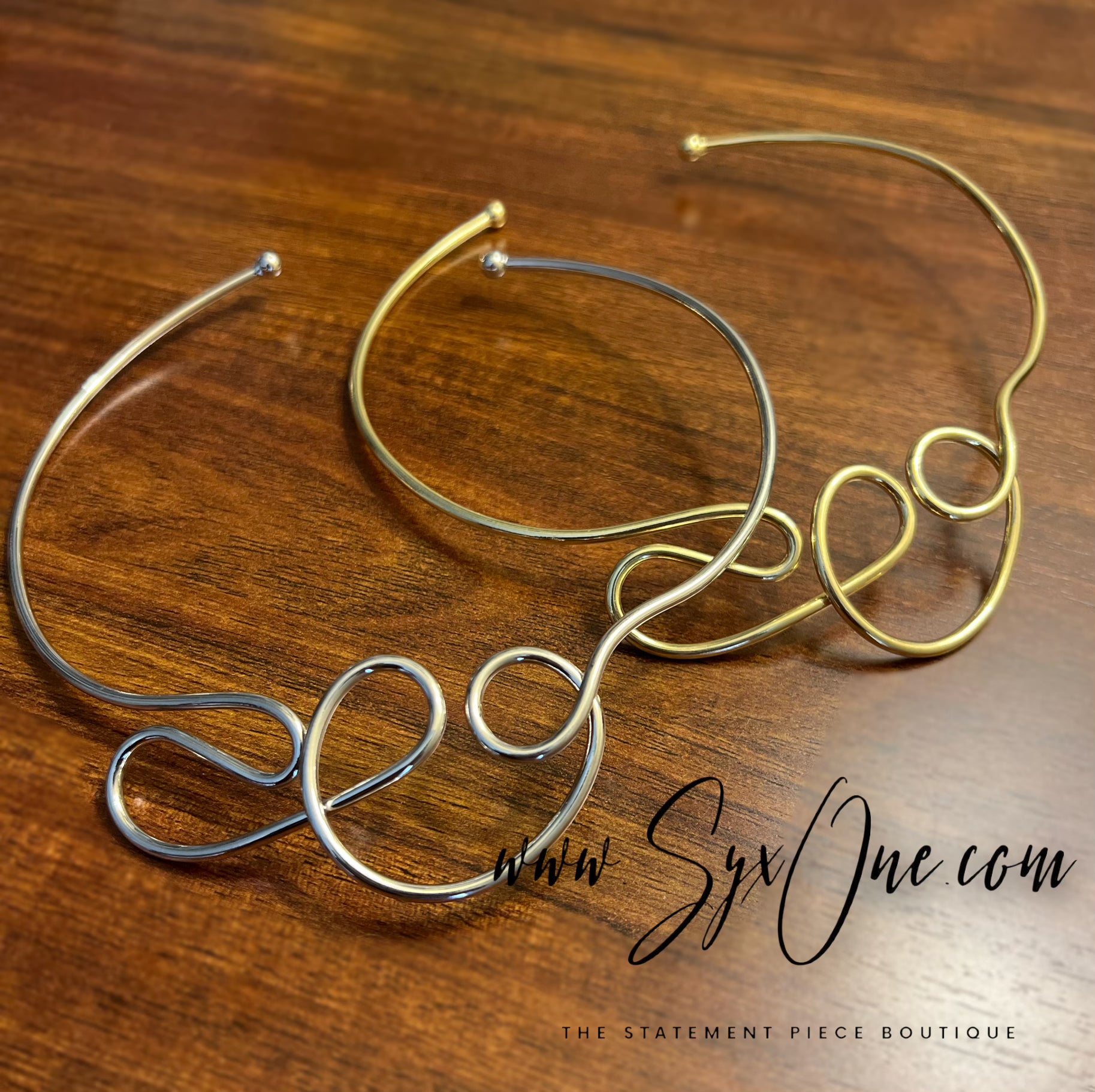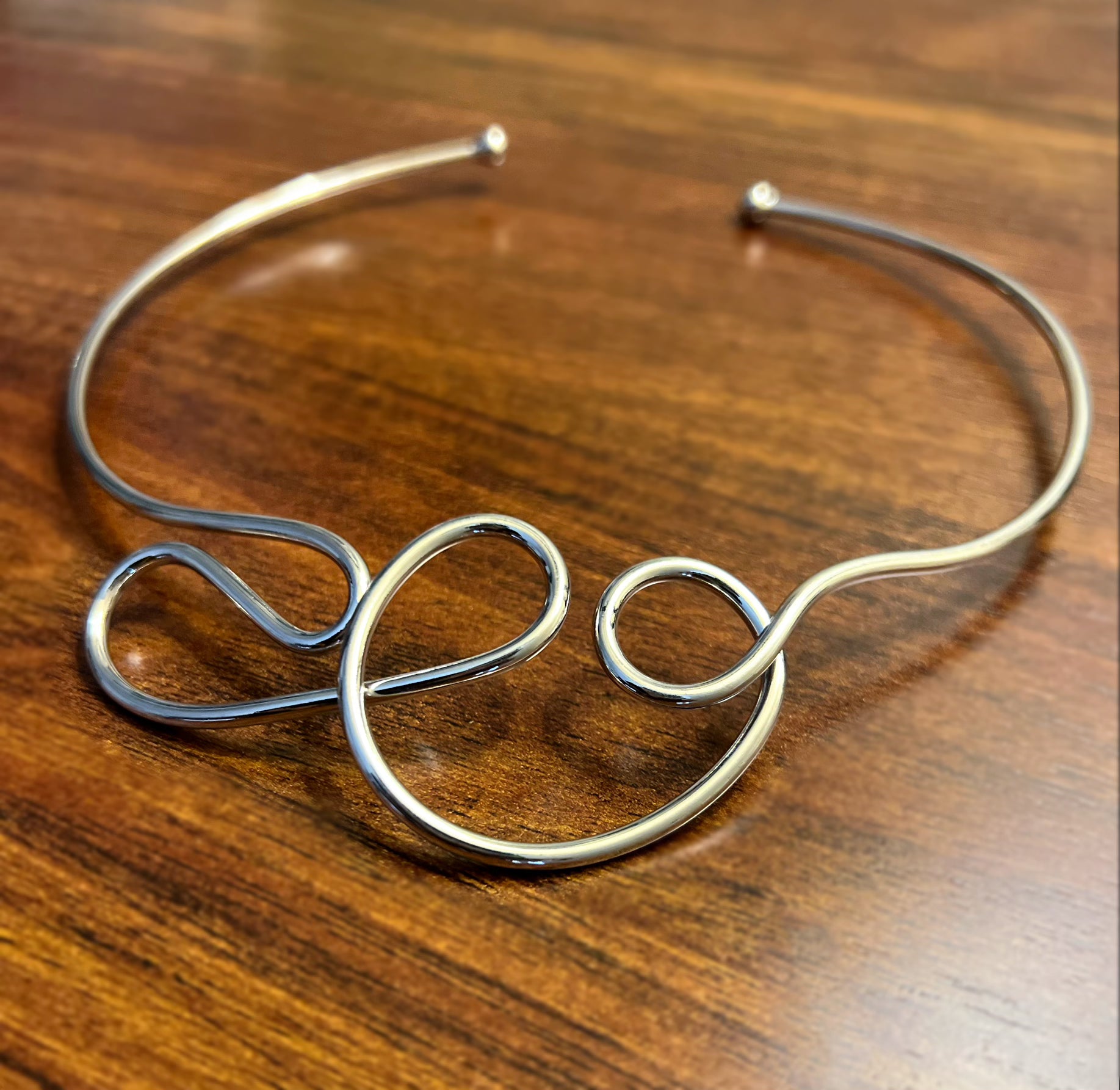 "The choker is expertly crafted with a geometric design in silver and gold. It measures 5 inches in width and is lightweight, weighing less than 1 lb. With adjustable sizing, this piece is sure to spark conversations."